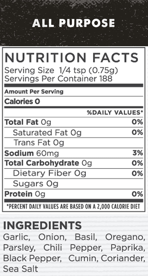 Introducing our all-natural all-purpose seasoning, the perfect addition to your spice collection! Crafted with care, this seasoning is a flavorful blend of herbs and spices that will enhance the taste of any dish. Made with only high-quality, natural ingredients, you can be sure that you're getting a healthy and delicious seasoning that you can feel good about using.